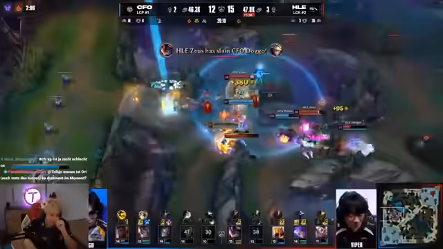 07:54:10Der Streamer beobachtet das laufende Spiel live und kommentiert die Entscheidungen der Spieler. Er stellt fest, dass der Jungler Peanut von CFO keine Camps farmt und stattdessen Vision kontrolliert, was als ruhiges und effizientes Spiel beschrieben wird. Ein Teamfight um den Drake eskaliert, wobei Doggo von CFO einen 'insanen' Play ausführt und aggressiv in das gegnerische Team eindringt, einen Double Kill erzielt und die Runde für sein Team gewinnt. Dies gibt CFO einen deutlichen Vorteil.