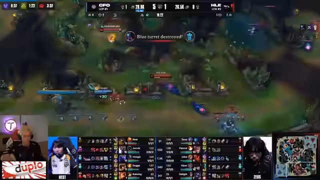 01:03:39Der Stream beginnt mit einem hektischen early Game, in dem HLE einen aggressiven Dive auf die Top-Lane startet. Der Play ist langgezogen und komplex, was zu einem Double Kill für PSG führt. Doggo von HLE zeigt eine beeindruckende Reaktion und vorhergesagt Vipers Flash. Dieser frühe Kampf hat bereits weitreichende Folgen für den Spielverlauf, da er den Rattenschwanz des Dives zeigt und PSG in die Defensive drängt. Der zweite Teil des Dives wird als sehr ambitioniert beschrieben, die Koreaner zeigen klare Absichten, das Spiel sofort in die Hand zu nehmen.