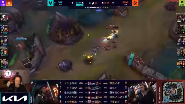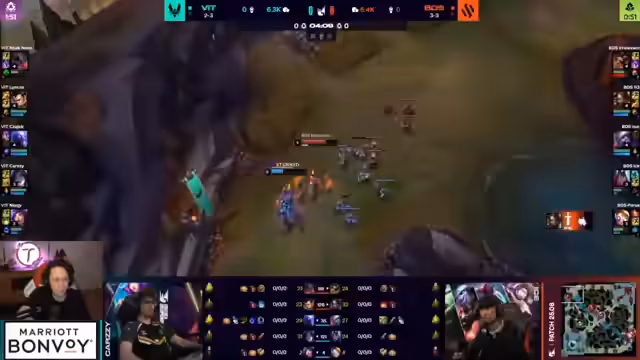 03:51:16Das Spiel dreht sich um die Kontrolle über wichtige Objekte wie den Drachen. Vitality zeigt gute rotationsfähigkeiten, um ihre Objektivziele zu sichern. Ein Teamfight entbrennt, in dem Vitality aufgrund von besseren Positionierungen und Nuklears starkem Corki-Damage die Oberhand gewinnt. BDS verliert dabei einen wichtigen Teamfight, was ihre Chancen schwächt. Analysten diskutieren die immer wieder auftretenden Teamfights und betonen, wie entscheidend diese für das Spiel sind und dass BDS diese gewinnen muss, um im Spiel zu bleiben.