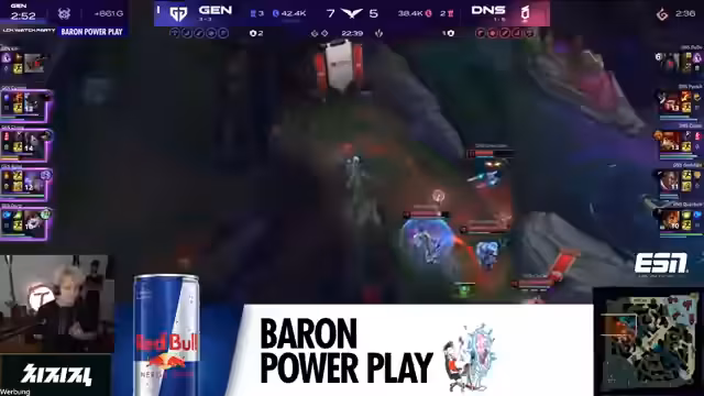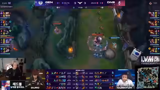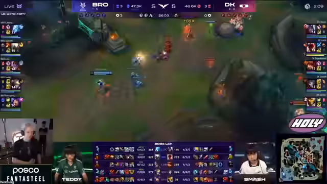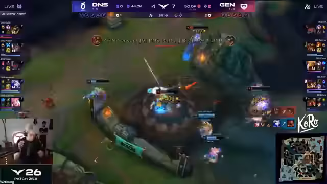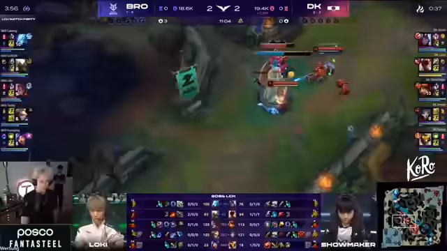 00:23:26Im späten Spiel werden alle Blicke auf das Teamfight um den Nashor gerichtet. Kommentator beschreibt minutiös die Taktiken beider Teams, wie sie versuchen, ihre Vorteile zu nutzen. Besonders bei BRO variiert die Strategie stark, manchmal wird passiv gespielt, manchmal aggressiv. DK gelingt es jedoch durch gezielte Flanks von Showmaker immer wieder, die Teamfights für sich zu entscheiden. Der entscheidende Moment occurs, als ein missglücktes Engagement von BRO nicht richtig坐标 hat, was zu einem drastischen Gold-Unterschied führt und quasi das Spiel für DK entschieden hat.