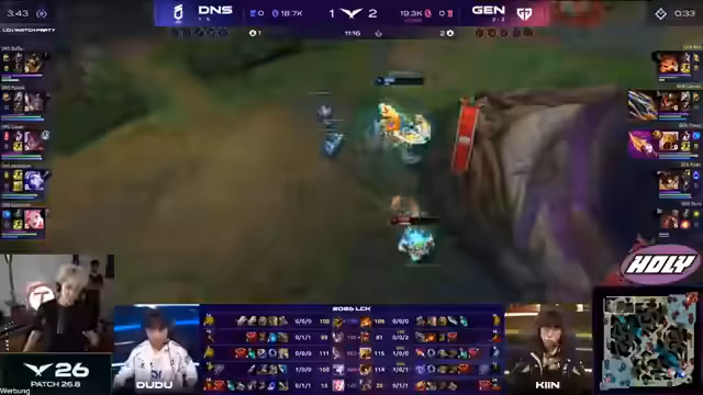 01:09:12Im Mid Game gewinnt Showmaker mit seiner Ari stark an Einfluss und dominiert die Mitte. Trotzdem zeigt sich, dass die Komposition der Bros zu unkoordiniert wirkt. Ein wichtiges Teamfight missglückt aufgrund falscher Ulti-Placement von Karsi. Lucid spielt stark durch, aber es reicht nicht aus, um das Spiel zu drehen. Die verlorene Teamfight-Situation führt zu einer signifikanten Gold-Differenz.