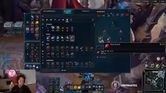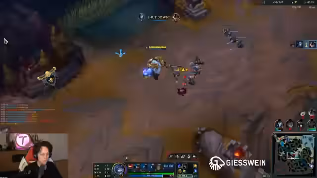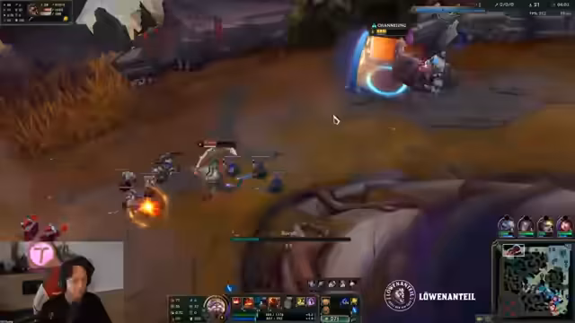 00:26:54Der Streamer analysiert ein gespieltes Match auf der Top-Lane mit Ornn gegen eine Illaoi. Er beschreibt strategische Entscheidungen wie das Anhäufen von Gold und den richtigen Zeitpunkt, um Items zu craften. Das Spiel ist von riskanten Manövern geprägt, etwa einem erfolgreichen Solo-Kill und einem späteren Fehler, der zu einem Goldverlust führt. Die Entscheidung, ein Item vorzeitig zu verkaufen, wird hinterfragt.