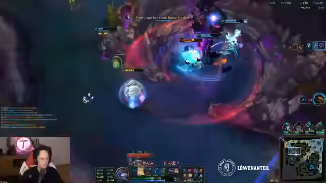 05:17:34Das Geschehen dreht sich um intensive Kämpfe um wichtige Objektive wie den Baron Nashor. Der Streamer beschreibt den Versuch, diese Kämpfe zu gewinnen, und analysiert die Items, die er oder seine Mitspieler einsetzen. Er spricht davon, wie wichtig ein korrekter Item-Build ist, um im Schaden mitzuhalten, und wie sich die Verteidigung oder Aufgabe des Nashors auf den Spielverlauf auswirkt.