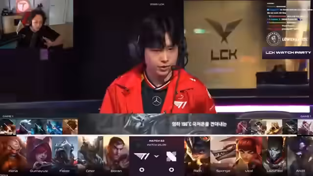 00:27:33Das erste Spiel beginnt und die Anfangsphasen werden analysiert. Doran auf Jace baut in der Top-Lane einen Vorsprung auf. Faker als Azir bewegt sich vorsichtig in der Lane gegen Annie. Es gab einen Versuch von Gamushi und Carrie, Faker anzugreifen, aber dieser konnte entkommen. Der Streamer erwähnt auch diverse persönliche Themen wie sein Frühstück und private Gespräche mit Chat-Mitgliedern.