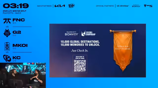 02:49:05Caps wurde in einem Post-Game-Interview zu dem Sieg gegen Fnatic befragt. Er äußerte sich überrascht über Fnatic's Leistung und lobte Schumanns Pantheon-Spiel. Caps erwähnte, dass Dylan sie gewarnt hatte, vorsichtig zu sein und Fnatic nicht zu unterschätzen. Er erklärte, dass G2 die Gang-Battle-Opportunitäten gut genutzt und Hans viele Gangs überlebt hat. Auf die Frage nach Mels Stärke antwortete Caps, dass der Champion situational stark ist und es Spaß gemacht hat, damit zu experimentieren. Er hofft auf weitere Spiele in der Serie und erwartet, dass KC das nächste Spiel gegen MKoy gewinnen wird. Nach dem Interview wurde versucht, weitere G2-Spieler für Interviews zu gewinnen, was sich jedoch als schwierig erwies. Es wurde spekuliert, dass die Spieler nach der 0-2 Niederlage möglicherweise keine Lust auf Interviews haben.