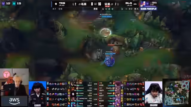 02:47:30Das Spiel beginnt mit einer aggressiven Level-3-Gank-Phase von Kanavi (Jarvan) für Top Esports. Er erfolgreich einen Kill auf Elk in der Bot-Lane holen, was ihm einen Goldvorteil verschafft und den Druck auf BLG erhöht. Der Caster lobt diesen Zug und vergleicht ihn mit der Leistung von Shadow. Gleichzeitig erhält Shadow den ersten Drachen, doch der Vorteil von Top Esports bleibt bestehen.