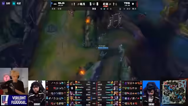 13:54:28BLG smurft Top-E-Sports nach einem starken Early-Game. Sie gewinnen die Dragons, den Herald und reduzieren den Gold-Rückstand. Der Mid-Turm fällt durch einen illegalen Play. BLG hat einen 3000-Gold-Vorsprung und vier Turrets geholt. Top-E-Sports verliert das Spiel, obwohl sie das bessere Early-Game hatten. Dies ist die letzte Chance; alle Verlierer fliegen raus. Das war ein Crazy Gaming Spiel, das im Replay analysiert werden muss. Der chinesische Frühlingsmeister wird an die Wand gezockt.
