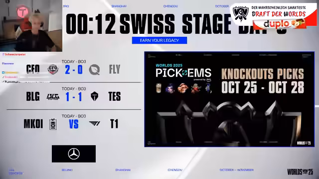 12:27:32Die Aufmerksamkeit verlagert sich auf die Turnierstruktur der Weltmeisterschaft. Teams, die 3-0 in der Gruppenphase abschließen, erhalten einen Vorteil im Viertelfinale, da sie gegen schwächere 3-2-Teams antreten. Die Seitenwahl im Viertelfinale ist ein entscheidender Vorteil, da die Blauseite agieren und reagieren kann. Die Play-in-Stage-Teams, wie Team On, hatten schlechte Platzierungen und mussten fast ausschließlich auf der Rotseite spielen, was als großer Nachteil gilt.