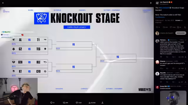 01:37:05Der Streamer diskutiert die möglichen Aufstellungen für das bevorstehende Viertelfinale und stellt fest, dass die 3-0-Teams im Turnierbaum getrennt von den 3-2-Teams platziert werden, um eine frühere Begegnung zu verhindern. Er erklärt die Vorteile der Seitenwahl im ersten Spiel für die höher gesetzten Teams und merkt an, dass ab dem Halbfinale alles auf einem Münzwurf basiert. Er erwähnt auch die besondere Situation von Team On, das aufgrund seiner Platzierung in der Play-in-Phase fast immer auf der Rot-Seite spielt.