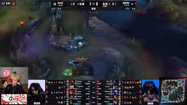 11:43:59FlyQuest zeigt im Midgame exzellentes Teamfighting. Bippo setzt seine Überlegenheit in der Top-Lane aggressiv ein, indem er Junjia, den Mid-Laner von CFO, jagt und ihn tötet, um einen zweiten Drachen zu sichern. Trotzdem gelingt es CFO, mit starker spielerischer Leistung und einem überlegenen Draft im Midgame, den Rückstand aufzuholen und zu überflügeln. Sie gewinnen Teamfights trotz des anfänglichen Goldrückstands und zeigen, dass ihre Draft im späteren Spielverlauf stärker ist.