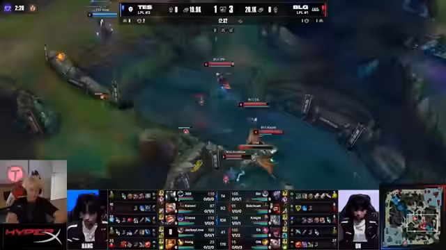 03:00:19Top-E-Sports beginnt das Spiel mit einem deutlichen Vorteil in der Top-Lane, doch BLG kann im Midgame die Drachen kontrollieren und den Goldvorsprung der Gegner auf ein Minimum reduzieren. Nachdem Junnare sein Kai-Item fertig gestackt hat, bauen sie ihren Vorteil weiter aus. Harald beschwört den mittleren Turm und BLG gewinnt wichtige Teamkämpfe, um den Druck auf Top-E-Sports zu erhöhen und mehrere Türme zu eliminieren.