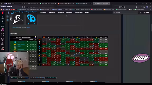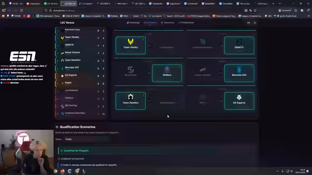 12:08:00Die Aufzeichnung beginnt mit dem Kommentar zum gerade beendeten Spiel zwischen Serien und Reddix, welches Reddix gewinnen konnte. Durch diesen Sieg sind sowohl Reddix als auch Fnatic in die Playoffs eingezogen. Die Situation für G2 und die Los Ratos ist jedoch dramatisch. Die Ränge sind extrem eng, und es bleibt nur ein verbleibender Playoff-Platz. Letztendlich wird dies in einem letzten Spiel zwischen den beiden Teams entschieden. Ein Sieg von G2 würde ihre Chancen wahren, während die Los Ratos nur durch einen G2-Niederlage weiterkommen.