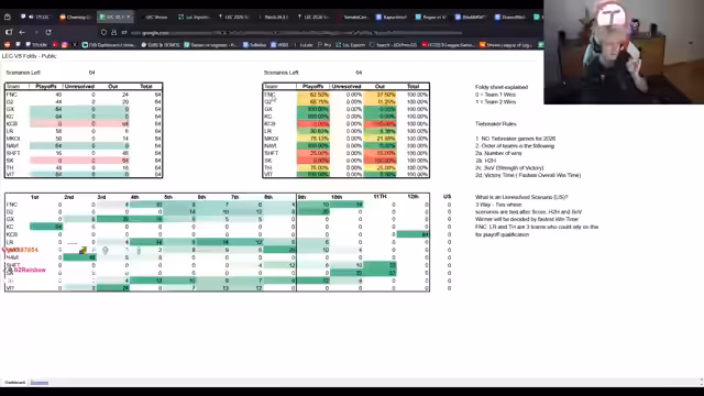 06:51:00Das Gespräch wechselt zur laufenden League of Legends Champions Korea (LCK). Der Streamer analysiert die verschiedenen Szenarien, die sich für die Playoffs ergeben könnten. Er ist sich über die komplexen Qualifikationsbedingungen und die Bedeutung von 'Head-to-Heads' und 'Strength of Victory'-Punkten unsicher und simuliert mögliche Ausgänge der verbleibenden Spiele. Insbesondere die Situation von Teams wie G2, Fnatic und Lost Atons wird als komplex und spannend beschrieben, da mehrere Teams noch auf Schützenhilfe angewiesen sind. Der Streamer äußert seine Vorlieben für bestimmte Teams und Szenarien.