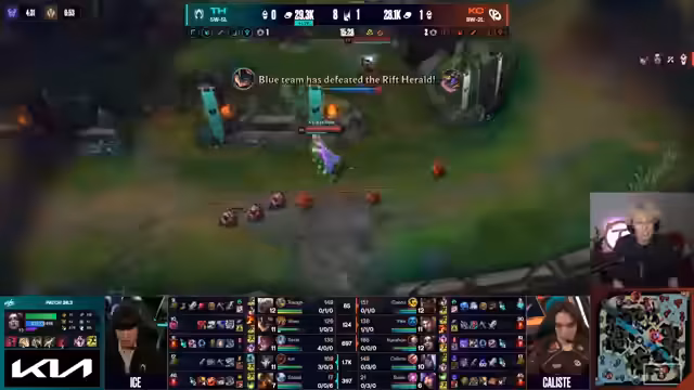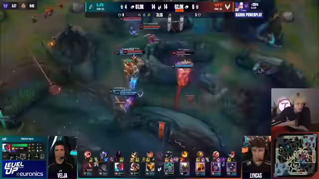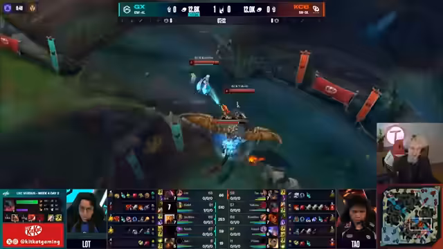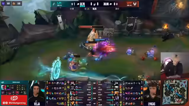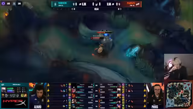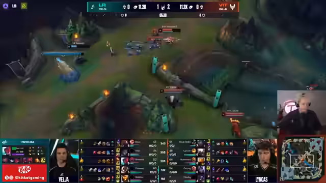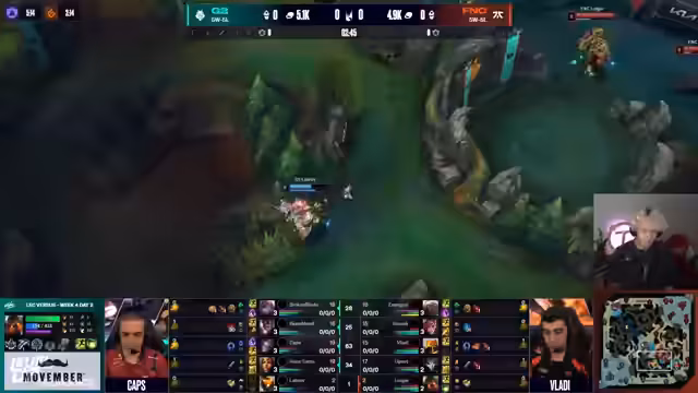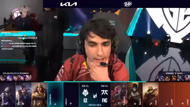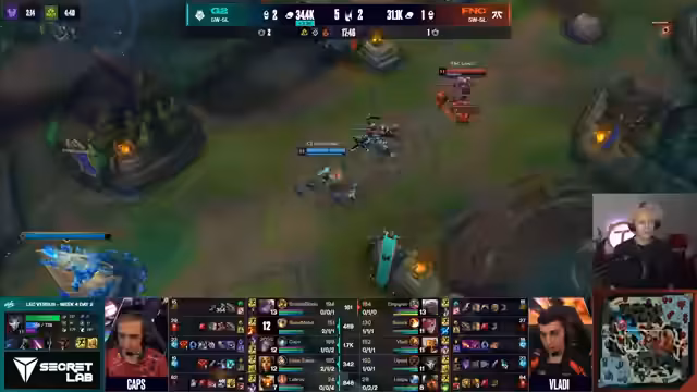 12:27:05Das letzte Spiel der Regular Season beginnt. Ein frühzeitiger Konflikt zwischen den Bot-Lanern eskaliert, als Nautilus gegen Vladimir versucht, Druck aufzubauen, aber seine Ultimativen Ability verfehlt. Gleichzeitig bereitet G2s Mid-Laner Caps einen Kill auf Vladimir vor. Dies führt zu einer chaotischen Situation, in der Vladamir sein Leben verliert und G2 einen frühen Vorteil erlangt. Dieser frühe Kill könnte einen entscheidenden psychologischen und strategischen Vorteil für G2 in diesem alles oder nichts-Spiel bedeuten.
