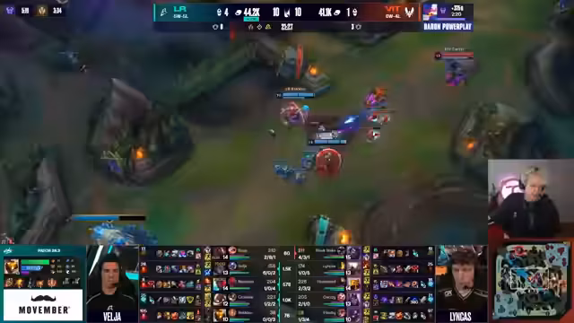 02:19:49Lost and Thrones' Playstyle wird als sehr leicht zu lesen beschrieben: Ranged Top-Lane, Enchanted Bot-Lane, Playmaking nur durch die Midlane und eine exzellente Objective-Kontrolle durch Vel'Koz. Wandas Top-Lane wurde als extrem dominant im Scaling eingestuft. DRX konnte das Spiel offenbar nicht beenden, selbst mit einem signifikanten Goldvorsprung. Baus wurde isoliert in der Top-Lane und konnte kaum agieren, da er unter dem Turm safe farmte.
