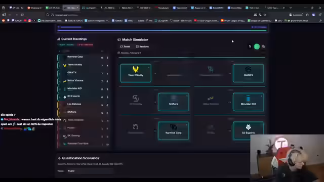 05:19:01Es werden die Playoff-Situationen der verschiedenen Teams wie Navi, Koi und Team Liquid diskutiert. Der Streamer betont die Bedeutung der anstehenden Spiele und verwendet ein Online-Tool, um die aktuellen Tabellen und Siegchancen zu simulieren. Die Simulation zeigt, wie knapp die Playoff-Ränge sein könnten und wie viel von den Ergebnissen der letzten Spiele abhängt.