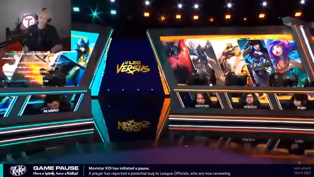 10:44:36Ein unerwartetes Ereignis unterbricht den Spielverlauf. Die Referees veranlassen eine Pause, da es den Anschein hat, dass der Spieler Jojo durch einen Bug auf dem Champion Pantheon unabsichtlich abgestiegen ist. Der Streamer und das Publikum spekulieren über den Vorfall, wobei einige es als Bug und andere als beabsichtigte Interaktion einstufen. Die längere Pause deutet auf ein mögliches Chrono-Break hin, bei dem das Spiel zurückgespult und der Moment neu gespielt werden könnte, um die Fairness zu wahren.