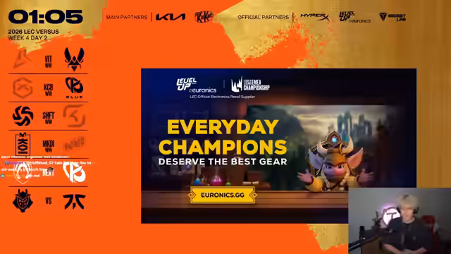 01:34:00Nach dem LCK-Spiel wechselt der Kommentar zur LEC, genauer gesagt zum letzten Tag der Regular Season. Es wird über die potenziellen Teams gesprochen, die die Playoffs verpassen könnten. Der Kommentator nennt mehrere Kandidaten wie G2, Fnatic, Heretics und Shifters und geht auf die komplexen Szenarien ein, die vom letzten Spiel zwischen G2 und Fnatic abhängen. Er diskutiert die Head-to-Head-Bilanzen und die Stärken der Teams.