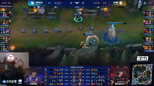 00:09:05Das erste Spiel beginnt auf dem Rift. NS hat den Firstblood-Pick mit Malphite, während DRX Azir und Yumara setzt. Es gibt eine technische Unterbrechung, als ein Spieler den Stream verlassen muss. Nach der Fortsetzung konzentriert sich der Streamer auf die Mid-Lane, wo das Match-up zwischen Azir und Orianna oft über Jahre hinweg eine Rolle gespielt hat. Die Anfangsphase zeigt, wie die beiden Teams ihre Lane-Prioritäten setzen und wie die Jungler auf den Scuttle-Krabbengang reagieren.