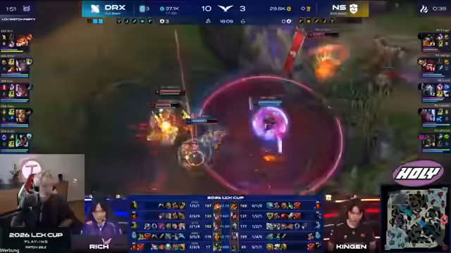 02:21:49Das Best-of-Five zwischen DRX und Nongshim RedForce wurde als langweilig und eindeutiger Stomp von DRX beschrieben. Jedes Game ging an DRX, was zu einer frustrierenden Niederlage für Nongshim führte. Scout, der für DRX spielte, wurde für seine AFK-Tendenz kritisiert, selbst als er einen Solo-Kill erzielte. Mit dem dominanten 3-0 Sieg sind DRX für die Playoffs qualifiziert und automatisch im Double Elimination Modus.