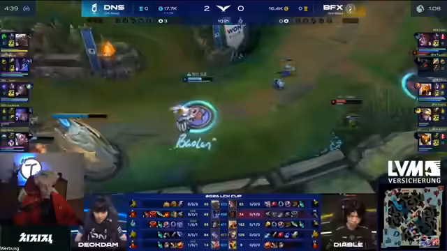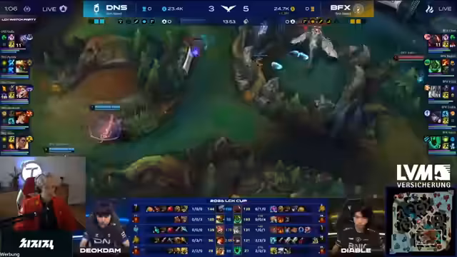 03:35:30Das Game beginnt mit kritischen Fehlern von BNK. Ihr Jungler versucht, den Blue Buff des Gegners zu invadieren, was in einen frühzeitigen Tod der Bot-Lane resultiert. DNS nutzt diesen Vorteil sofort aus und geht in eine dominante Führung. Piosik auf Rammus zeigt eine herausragende Leistung, gankt erfolgreich und sorgt für einen signifikanten Vorsprung. Die Top-Lane-Duelle, insbesondere zwischen DuDu und Diabol, bleiben ein zentraler Faktor für das Spielgeschehen.