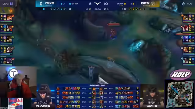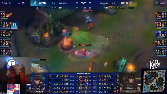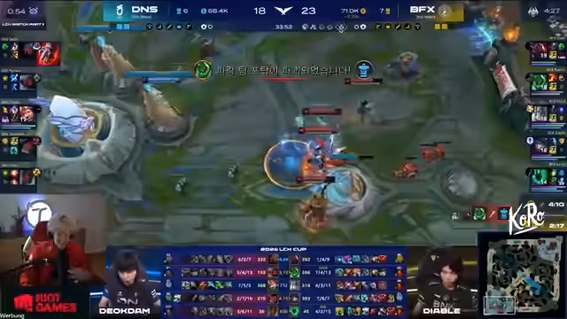 03:54:50BNK kämpft sich in das Mid-Game zurück, jedoch erweist sich die Draft mit vier Tanks als problematisch, da sie wenig Schaden in der Tiefe bieten. Der fehlende Flash des AD Carries Smolder im Teamfight wird als kritischer Schwachpunkt identifiziert. DNS kann weitere Objive wie den Drachen sicherstellen, die den Druck auf BNK aufrechterhalten. Piosik und DuDu agieren als die zentralen Carry-Spieler für DNS, während bei BNK vor allem die Bot-Lane unter Druck gerät.