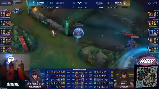 02:38:06Im vierten Spiel geht die Analyse stark auf die Top-Lane, in der DNS's Dudu mit Rek'Sai eine beeindruckende Leistung zeigt. Er dominiert die Lane und verhindert jeglichen Druck von BNK's Zahin. Kommentatoren loben Dudos Spielweise und seine Fähigkeit, Druck aufzubauen und Maps zu kontrollieren. BNKs Composition um Pantheon und Poppy wird als stark für objektive Kontrolle bewertet, doch die anfängliche Top-Lane Niederlage zwingt BNK zu riskanten Plays in der Bot-Lane, die sich am Ende nicht ausgezahlt haben und zur klaren Niederlage führten.