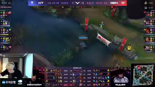 01:12:26Gen.G befindet sich in einer vorteilhaften Position, da ihr AD-Carry 5/0/5 steht und Level 16 erreicht hat, während auch eine Oriana Voidstaff und Deathcap bald erreichen sollte. Es wird als schwierig angesehen, das Spiel zu gewinnen. Der Streamer ist nicht allzu verärgert über den Draft-Hard von KT. Der KT-Rollercoaster erreichte vor einigen Wochen seinen Höhepunkt gegen Gen.G und befindet sich nun im Abstieg. Ruler dominiert das Spiel mit einem Double-Kill, Triple-Kill und Quadra-Kill. Gen.G startet die Serie mit einem dominanten Auftakt. Es wird niemanden wundern, dass Gen.G wieder als Favorit ins Finale gegen Hanwha geht, da sie dieses Jahr noch nicht gegen Hanwha verloren haben. Der Streamer betont, dass es sich nur um Spiel 1 handelt und alles machbar ist.