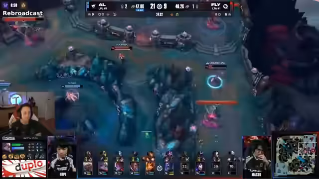 02:57:50Nachdem sie eine frühere Verfolgungsjagd für sich entscheiden konnten, setzt AL konsequent auf die Kontrolle über wichtige Objektive. Der Drake wird schnell von ALs Offlane-Spieler genommen, was Gold und Map-Pressure bringt. Die folgenden Teamkämpfe um Drakes und Türme werden als klare Dominanz von AL dargestellt. Besonders Tarsan auf Poppy glänzt dabei mit mehreren Plays, in denen er gegnerische Dashes mit seiner E blockiert und Gegner an Wände pinnt. Shanks auf Aurora liefert ebenfalls massiven Damage und sorgt für mehrere Multi-Kills, während FlyQuests unkoordinierte Angriffe fehlschlagen.