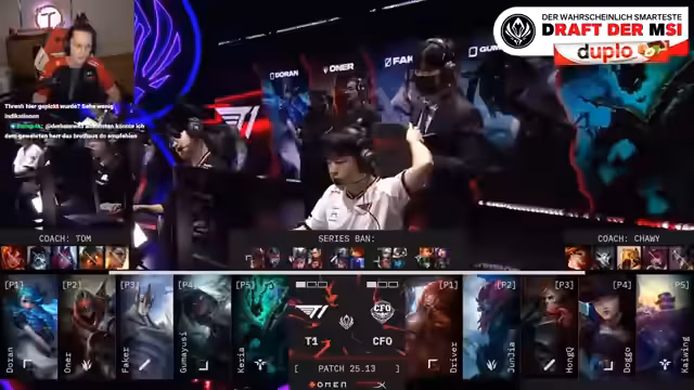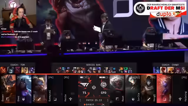 13:13:43Das Spiel beginnt, und der Streamer beschreibt den Early Game Verlauf. Faker auf Oriana ist gegen Onic auf Tristana in einer schwierigen Lage, zeigt aber mit starken Plays sein Können. Junjia mit Sejuani sorgt für Druck in der Map und cleart effizient den Jungle. Doran auf Top-Lane behauptet sich und gewinnt seinen Lane gegen den Ornn von CFO, was T1 einen Goldvorteil beschert.