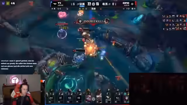 09:46:34CFO zeigt im weiteren Verlauf des Spiels einen sehr aggressiven und initiativen Spielstil, was in einem chaotischen Teamfight gipfelt. Pantheon nutzt seine Ultimate, um überraschend einzufallen und scheint den Kampf zu gewinnen. T1 ist jedoch in der Lage, mit koordinierten Flanken und cleverem Positionieren den Fight zu drehen. Besonders Keria mit seiner Annie und Faker mit seinem Viktor spielen eine entscheidende Rolle und zeigen ihre hohe Klasse.