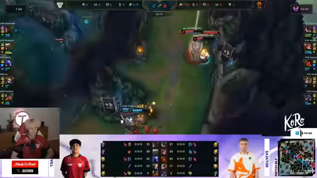 05:25:24Das Live-Game gegen Team Orange Gaming ist sehr ausgeglichen und geht bis in die sparte Phase. Zentrale Teamfokus-Ereignisse drehen sich um den Kampf um den Elder-Drake. G2 Nord ist Gold vorn, hat aber weniger Drakes. Ein entscheidender Fehlschlag von Shelfy führt zu einem kritischen Teamfight-Verlust. Trotzdem bleibt das Spiel knapp, bis Team Orange Gaming den Nexus zerstört und den Sieg holt. Der MVP des Gegnerteams wird als Kuh gelobt.
