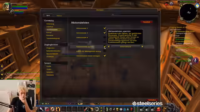 00:02:47Der Streamer stellt das YouTube-Video von Sieglinde vor, das Anfängern in Hardcore-WoW bei der Orientierung in den zahlreichen Optionen hilft. Er startet mit einem frischen Charakterprofile und erklärt systematisch 16 als besonders relevant eingestufte Einstellungen, beginnend mit den Aktionsleisten. Dabei wird die Sperrfunktion der Leisten betont, um versehentliches Verschieben von Fähigkeiten zu verhindern, und die Anzeige von Abklingzeiten für Tränke als überlebenswichtig hervorgehoben.