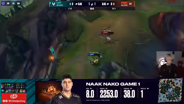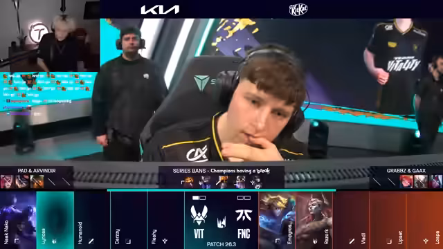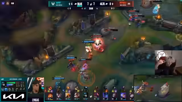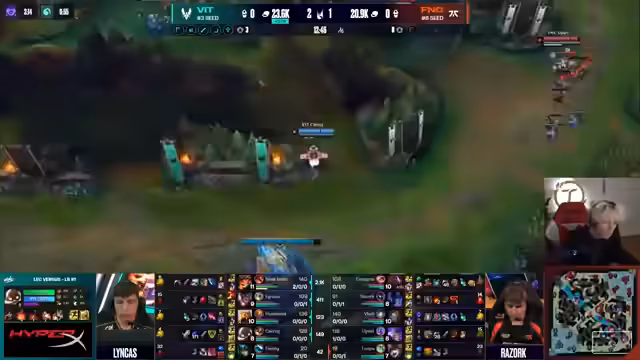 10:53:39Ein technischer Bug wird angesprochen, aber der Spielverlauf geht weiter. Anarko zeigt einen exzellenten 1v1-Kill gegen Ampys Top. Vlad, bisher unberührt, erhält Gold und wird zur One-Shot-Bedrohung. Fnatic muss den Druck erhöhen, verliert aber in einem Teamfight, bei dem alle Flashes verloren gehen. Dies führt zu einem massiven Goldvorteil für Vitality und putscht die Niederlage für Fnatic näher.