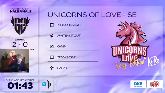 07:48:44Die Serie gegen Unicorns of Love endet nach zwei Spielen mit einem klaren 2-0 Sieg für G2 Nord. Game 1 war umkämpft und wurde durch ein starkes Comeback entschieden, während Game 2 durch eine objektiv bessere Draft und dominantes Spiel von Anfang an geprägt war. Kommentator und Team zeigen sich hochzufrieden mit der Leistung und verweisen auf historische Siege gegen starke Gegner wie Spandau.