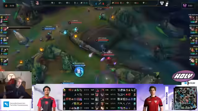06:40:15Das Spiel beginnt mit einer Analyse der initialen Power Spikes beider Teams. Das eigene Team hat bereits Koenig Roken, Chestblade und Blackfire Torch bei Oriana, während die Gegner, Unicorns of Love, Natchez-Do-Sunderskai und bald Triforce besitzen. Das Ziel ist, die Kontrolle über das Spiel zu erlangen, insbesondere im nächsten Drachenfight, da der erste Drache nicht gewonnen werden konnte. Der Fokus liegt darauf, immobile Champions zu schützen und sich der Gefahr durch einen gegnerischen Bartold in der Bot-Lane bewusst zu sein.