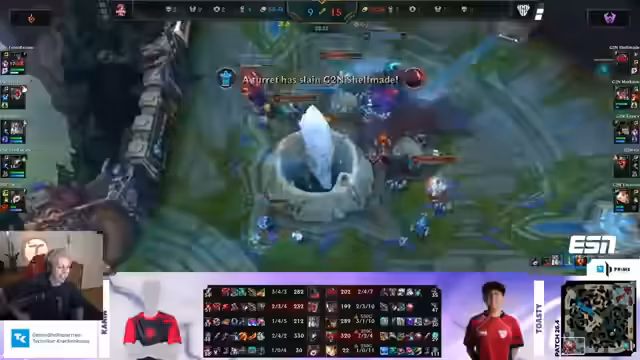 06:58:35Ein schwerwiegender Fehler führt zu einem verheerenden Teamfight. Makun und Torquimo versuchen, die gegnerische Gwen zu töten, was sich als extrem naiv erweist, da diese bereits sehr tanky ist. Dabei werden die Flashes beider Carries verloren und beide sterben. Dieser Fehler ist besonders schmerzhaft, da der Drake und das Gold verloren gehen und das Game fast verloren scheint.