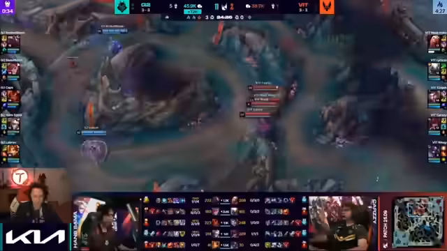09:42:44Die Teams streiten um den Nashor, wobei KT den Versuch früh startet, aber T1 den Nashor erfolgreich vereitelt, da der DPS von KT zu gering ist und KT eine Varus-Kali-Kombination wählt. Der Analyst sieht diesen Versuch als nachvollziehbaren Play an, kritisiert aber die späte Ultimativ-Nutzung von KT auf 4.000 Leben des Nashors. Nach der Vereitelung bemerkt er, dass KT nun mehr Kontrolle über Objectives hat, während T1 mit Oriana und Jhin mehr späte Schadensoutput besitzt, aber nicht in der Position ist, zu kämpfen. Das Spiel ist extrem ausgeglichen und beide Teams benötigen den Sieg dringend für die Playoffs.