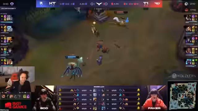 00:00:00Zu Beginn des Streams wird der Wettbewerb zwischen T1 und KT als spannendes Matchup eingestuft, wobei Oner von T1 als der beste Spieler der letzten Zeit identifiziert wird. Die Draft-Phase von Game 1 beginnt mit Varus und Yone, die sofort gebannt werden. Taliyah wird von T1 ausgewählt, was KT wahrscheinlich dazu veranlasst, Azir zu picken. Ein entscheidender Moment ist die Wahl von BDD, der Rumble statt seines Champions Xin Zhao auswählt, was als sein Signatur-Champion gilt. KT entscheidet sich dann für Jhin als Bot-Lane-Damage und Galio für die Top-Lane während T1 Ahri für Faker im Mid-Lane wählt.