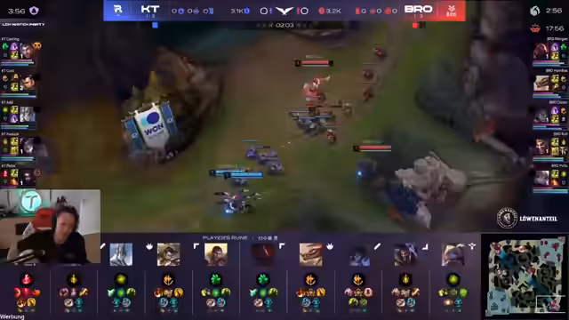 04:01:07Das Spiel entwickelt sich in ein sehr langes, ausgeglichenes Spiel. Die Bros sind leicht im Rückstand, aber der Bulle hält an seiner Draven-Strategie fest, um im späteren Spiel zu triumphieren. Der Streamer wendet sich der Leistung der Teams zu, wobei KT als Team gilt, das mechanisch stark ist, aber oft als Team schwächer agiert. Im Gegensatz dazu wird BDD als bester Spieler von KT und MVP in ihren Siegen angesehen. Die Region Korea wird als die stärkste der Welt angesehen, wobei der Gap zwischen Korea und anderen Regionen wie LEC und China als erheblich beschrieben wird.