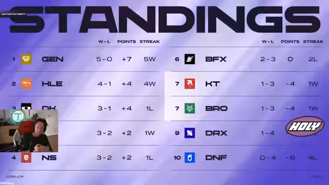 02:02:29Der Streamer analysiert die Ausgangslage des Matches zwischen DRX (Bros) und KT. Trotz identischer Tabellenplätze wurde KT im Vorfeld als favorisiert angesehen, da sie gegen stärkere Teams wie Homilife Sports, DK und T1 antreten mussten, wenn auch mit einem Ergebnis von 0-2. Die Teams befinden sich in einer kritischen Phase der Saison, da es sich um ein 6-Punkte-Spiel handelt, das direkt über die Qualifikation für die Playoffs entscheiden kann.