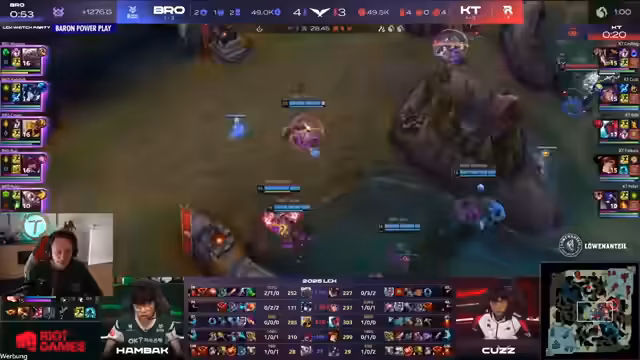 04:15:20Die Teams befinden sich in einem intensiven Schlagabtausch, wobei DRX's Paulu eine herausragende Leistung zeigt, indem er den Kampf trägt und wichtige Spells einsetzt. Trotzdem gerät DRX durch Trades ins Hintertreffen. Der Streamer analysiert die Situation und hebt hervor, wie wichtig es wäre, wenn Kloser seine Ult durchbringen könnte, was sich jedoch als schwierig erweist. Trotzdem sichern sich die Bros den Herold und den Drake, was sie ins Midgame katapultiert, obwohl sie Gold-technisch im Nachteil sind. Der Streamer betont die Schwäche von Vassalus ohne Ult und schlägt Victor als bessere Wahl vor. Er kritisiert Closers riskantes Spielverhalten und lobt Paulus Beitrag zum Teamkampf, indem er Schaden absorbiert und Gegner ausschaltet. Paulu sichert sich mit einem Hextech Flash ab. Der Fokus liegt auf KT, die den Drachen kontrollieren, während DRX auf Teleport-Plays setzt. Die strategische Bedeutung von Jace wird hervorgehoben, um Schockwellen gegen die Gegner einzusetzen.