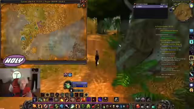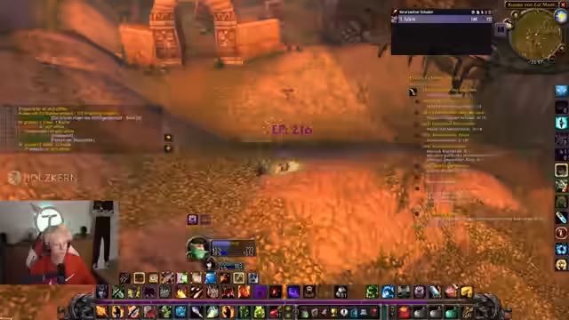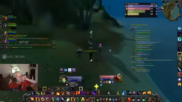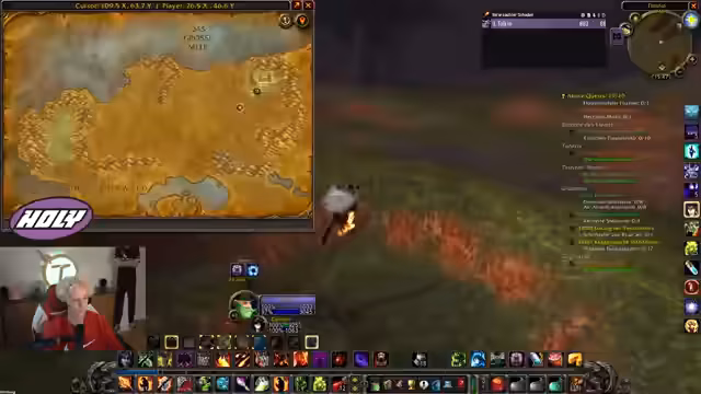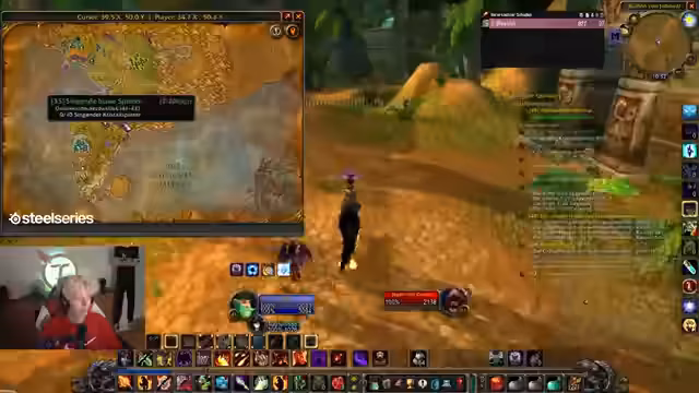02:13:30Innerhalb des World of Warcraft-Gameplay wird die Strategie der Levelzunahme thematisiert. Der Streamer überlegt, ob es sinnvoller ist, weiter in Desolace zu questen oder stattdessen Kräuter für die Alchemie zu sammeln. Er beschließt, das Leveln vorerst zu stoppen und stattdessen in Dungeons zu gehen, um gemeinsam mit anderen Spielern zu erleben und die Zeit zu nutzen, bis andere aufholen. Es zeigt sich ein kleiner Streit mit dem Chat über den Levelfortschritt und die Prioritäten.