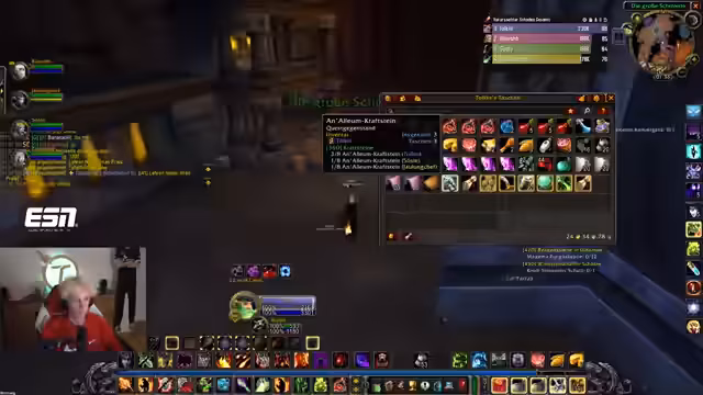 15:25:30Vorbereitungen für einen Dungeon-Run werden getroffen, wobei es Diskussionen über die bevorstehende Loot-Verteilung gibt. Ein Teilnehmer schlägt ein Würfelsystem vor, bei dem Items nur von einer Person gelootet werden, um Konflikte zu vermeiden. Der Streamer stimmt dem zu und wünscht sich darüber hinaus den Drop eines speziellen, epischen Schilds, der angeblich von einem Boss im Dungeon gedroppt wird, und bittet die Gruppe, bei diesem Loot mitzudenken.