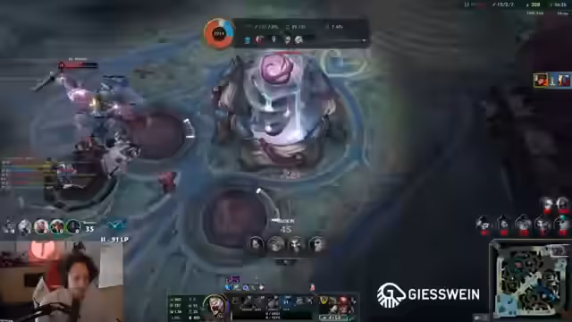 10:28:02SK Gaming sieht sich in einer kritischen Spielsituation mit einer potenziellen Niederlage konfrontiert. Das Team versucht mit einem Nashor-Power-Play das Spiel zu drehen, während der Gegner bereits bei 6000 Nashor-Power steht. Es gibt Diskussionen über die richtige Strategie, Hans-Sama wird als entscheidende Figur genannt. SK kämpft um jeden Turm, während der Gegner weiter Druck aufbaut. Die Situation eskaliert, als Ryzo versucht, Hans-Sama anzugreifen, aber selbst eliminiert wird.