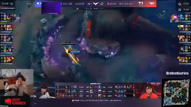 00:20:23T1 dominiert einen entscheidenden Teamfight gegen DK, ohne selbst einen Todesfall hinnehmen zu müssen. Dieser Kampf führt zur Eroberung des Nashors und gibt T1 einen massiven Vorteil im Spiel. Fakers Leistung ist dabei herausragend, mit hohem Schadensaustausch und cleverem Positionsspiel. T1 nutzt diesen Vorteil, um das Spiel zu kontrollieren und den Sieg sichern.