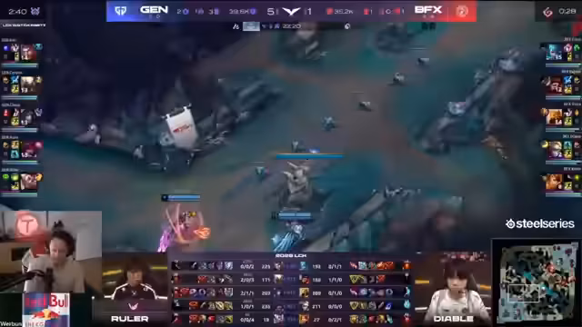 02:36:13BFX macht im Mid-Game entscheidende Fehler, die Gen.G die Möglichkeit zum Comeback geben. Insbesondere der Tod des Supports Kellen ist fatal, da dies die Vision-Kontrolle komplett verloren gehen lässt und Gen.G freie Hand bei Objectives wie Drake gibt. Der Analyst kritisiert, dass BFX nicht ausreichend auf_spawn-zeiten von Objekten achtet und nicht genügend Druck auf Gen.Gs后排 ausübt.