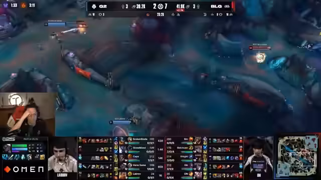 01:42:24Das Spiel wird durch eine Reihe kritischer Fehler entschieden. Ein vermeintlicher Solo-Kill von Broken Blade entpuppt sich als ein Klon von Niko, was zu großer Verwirrung führt. Später sterben Hans Sama und Caps in kurzer Folge, was den Goldvorteil von BLG massiv ausbaut. Ein besonders bitterer Verlust ist der Tod von Caps, der Mr. Consistent, der den G2-Spielern in der Vergangenheit am wenigsten Probleme bereitet hat. Diese unglückliche Serie von Todesfällen führt zu einer rapiden Verschlechterung der Position von G2.