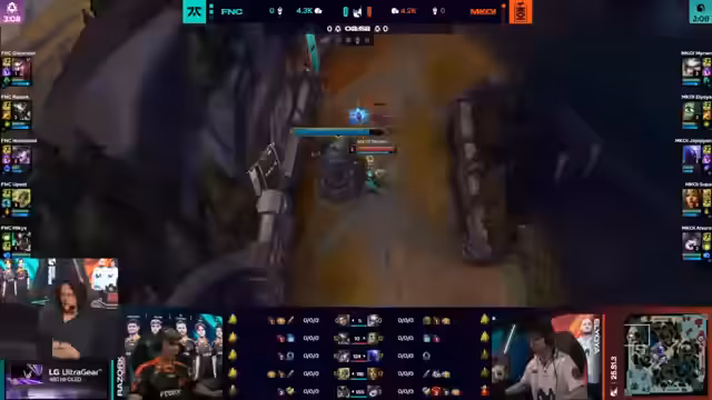 00:00:00Die Kommentatoren analysieren die ersten Minuten des Spiels, bei denen sich Caps von G2 Esports aggressiv bewegt, um Vladdy zu jagen. Yike von Fnatic reagiert, aber der Versuch scheitert, da sein Sschlag nicht ausreicht. G2 Esports kann zwei Gegner in der Mittellinie eliminieren. Später gerät OpTic in eine schwierige Situation, als ein Mitglied erwischt wird und das Team den Rückzug antreten muss, obwohl sie versprechen zu kämpfen und alternative Pläne haben, um wieder ins Spiel zu kommen.
