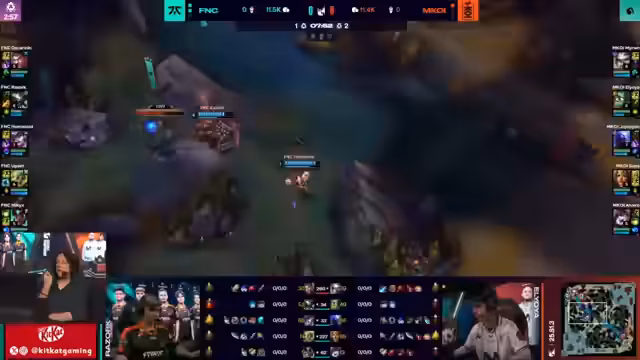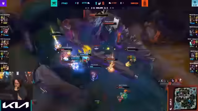 02:00:27Fnatic riskiert einen Trade, der sich als ungünstig erweist, indem sie Atakan exponieren, obwohl sie den Vorteil am Bot hätten ausspielen können. Der Verlust des zweiten Drakes (Hextech Drake) wird in Kauf genommen, da er als weniger wertvoll erachtet wird. Movistar Koi nutzt die Situation, um Fnatic unter Druck zu setzen, während Fnatic versucht, das Gebiet zurückzuerobern. Q von Fnatic zeigt wenig Wirkung, während Movistar Koi den Drake mit Atakan startet. Fnatic verliert den Drake und mehrere Teammitglieder, was Movistar Koi einen Vorteil verschafft. Movistar Koi gewinnt wichtige Teamfights und sichert sich Türme, während Fnatic Schwierigkeiten hat, Objectives zu kontrollieren. Movistar Koi nutzt Maokais Ult effektiv, um Fnatic zu kontrollieren und Vorteile zu erzielen. Fnatic's Midgame-Powerspike neigt sich dem Ende entgegen, während Kai'Sa weiterhin Gold hinterherhinkt. Movistar Koi ist im Vorteil, da ihre Carries besser skalieren. Fnatic versucht einen Angriff, verliert aber wichtige Ressourcen und muss sich zurückziehen. Movistar Koi startet Nashor, während Fnatic Schwierigkeiten hat, zu verteidigen. Kai'Sa erhält einen Double Kill, aber Fnatic gibt dennoch Nashor auf. Fnatic verliert Nash und Duelist, was Movistar Koi einen entscheidenden Vorteil verschafft. Kai'Sa kann Ezreal ausschalten, was Fnatic zusätzlich schwächt. Fnatic zeigt jedoch mentale Stärke und kommt trotz eines großen Defizits zurück ins Spiel. Movistar Koi nutzt Nashor für zwei Waves und ignoriert den Drake. Fnatic bestraft einen Fehler von Movistar Koi und erzwingt einen Fight am Turm. Fnatic sichert sich den Soul-Point und bereitet sich auf die Seele vor. Kai'Sa hat ihre Zhonyas fertig und ist bereit für Teamfights. Fnatic lässt Hoffnung aufkommen und das Spiel bleibt spannend. Movistar Koi hätte das Spiel gewinnen können, wenn sie Nashor erzwungen hätten. Fnatic kehrt aus einem verlorenen Spiel zurück und zeigt ihre Widerstandsfähigkeit.